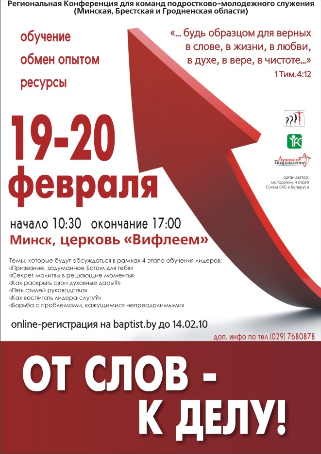 «Секрет молитвы в решающие моменты» «Как раскрыть свои духовные дары?» «Пять стилей руководства» «Как воспитать лидера-слугу?» «Борьба с проблемами, кажущимися непреодолимыми» и др. На конференции будет возможность приобрести ресурсы печатного и электронного форматов, которые могут стать помощью в работе с подростками и молодежью. Место проведения конференции: г.Минск, ул.Горецкого, 93, церковь «Вифлеем». Начало: 19 февраля, 10:30. Окончание: 20 февраля, 17:00 Внимание: регистрация на конференцию в режиме on-line на baptist.by до 14.02.10. С уважением, молодежный отдел Союза ЕХБ в Беларуси |