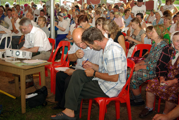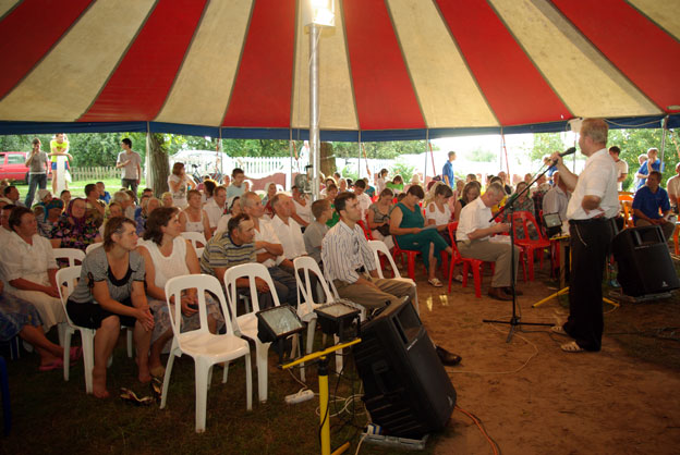 В Лахве люди со свадьбы шли на праздник христианской музыки и слова «Исцеляющая любовь»![]() И вот настали дни христианского праздника. Храм-палатка расположилась перед Домом молитвы, который был построен еще во времена, когда Западная Беларусь была под Польшей. Члены церкви беспокоились по поводу того, что как раз на те выходные, когда планировался христианский праздник, в деревне было назначено три свадьбы. Одна из них была в ста метрах от храм-палатки. Но волнения были напрасными, потому что гости свадьбы во время проведения основного служения приходили послушать Слово Божье и христианские песни. Каждый день храм-палатка наполнялась народом, и в основном это были люди из Лахвы, хотя и жители других деревень, таких как Редигерово, Мокрово, Лаховка, Любань, приезжали сюда. На детской программе палатка была заполнена детьми, которых было здесь не менее чем 150 человек каждый день. Это стало большой радостью для церкви и всех организаторов. А молодежь собиралась на общения уже после девяти часов вечера. Христианские песни, сценки, пантомимы и Слово Божье вдохновляли их на смирение, покаяние и служение Богу. Интересно отметить, последний день праздника ознаменовался тем, что вышла туча и на ее фоне в лучах солнца заискрилась своим семицветьем радуга. А на дереве над храм-палаткой в своем гнезде постоянно «сторожили» аисты. Знаки мира и благоволения Божьего были явлены народу в Лахве. Примерно десять человек в анкетах заявили о том, что покаялись пред Богом в своих грехах. И дай Бог, чтобы эти маленькие росточки веры в сердцах людей не погибли среди терний этого мира, а возросли во славу Божью. |
